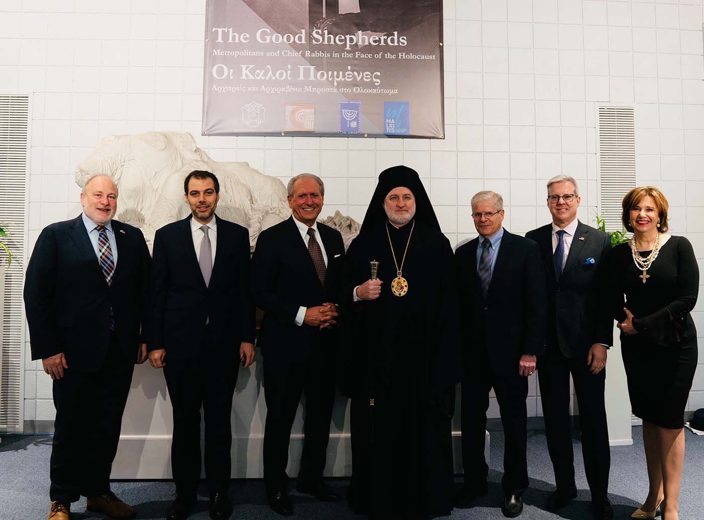 The exhibition features inspiring tales of heroism of the “Good Shepherds”. In both Greek and English text, the “Good Shepherds” panels are a sobering encapsulation of both the basest crimes perpetrated by humans against other human beings – the result of a fallen world- and also the uplifting witness of the triumph of the human spirit over evil, as evidenced by the indomitable legacies of these good shepherds. In his remarks, His Eminence Archbishop Elpidophoros of America urged that the exhibit be received as a call-to-action: “The brave rabbis and clergy who came together and found a way to preserve life, even as they preserved the human spirit and their God-given dignity, are calling us to follow their example. They were good shepherds of their flocks, who were willing to lay down their lives for the sake of their sheep”.