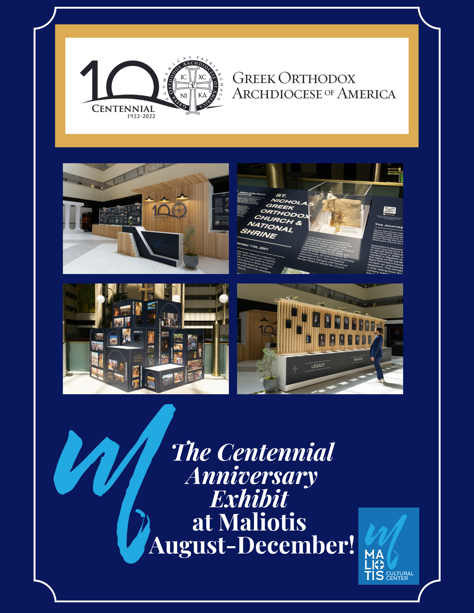 The Centennial Exhibit of the Archdiocese, which made its debut at the 2022 Clergy-Laity Congress in New York City, can presently be found at the Maliotis Cultural Center in Boston, MA on the campus of Hellenic College Holy Cross Greek Orthodox School of Theology. The exhibit will remain at the Cultural Center until the end of 2022. All are welcome to visit the Maliotis Cultural Center and to not only see our past history, but to become an integral part of our future history as well.